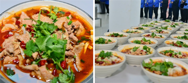 节日怎能缺少美食?食堂招牌水煮肉片重磅登场!嫩滑的肉片浸润在红亮麻辣的汤汁中,配上脆爽的蔬菜,一口下去,鲜香麻辣在舌尖绽放,寒意瞬间消散。