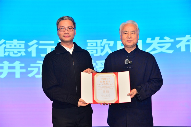 活动高潮,邢老师发布了专为固锝创作的歌曲《明德行》,并永久授权给苏州固锝使用。吴董现场接受这份珍贵礼物。